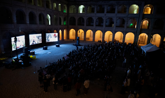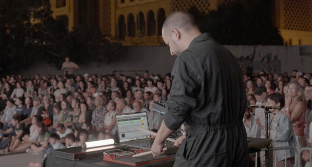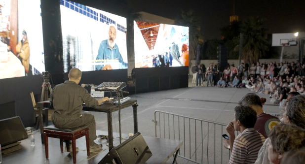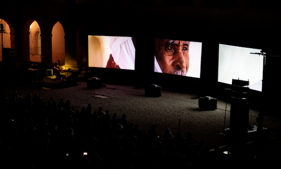 The work is projected in 270° panoramic format across three screens, creating a visual and sonic map of Tunisia’s musical heritage. Inspired by the ultra-score technique, Khalil interacts live with the original sounds from the documentary, expanding and transforming them through synthesizers and electronic devices.